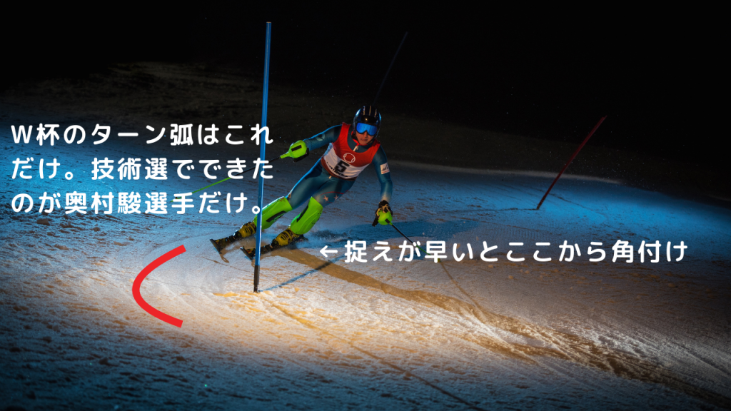 武田竜選手が斜面や雪質が変化しても同じように滑れる滑り方は、最もミスが少ない滑り方であり、劇的に変わったのが奥村駿選手だけだったという話だったのではないかと思います。