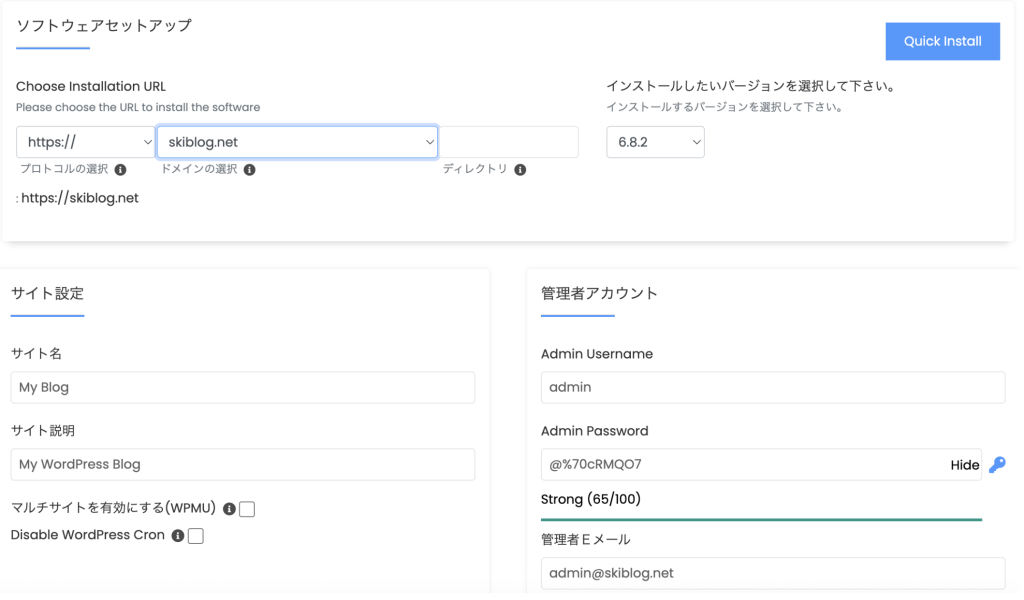 - 「Admin Username」はログインIDのこと。adminのままだとサイバー攻撃で侵入されやすいので、自分でわかるものを入力し、そのIDはメモなどでも保存。
