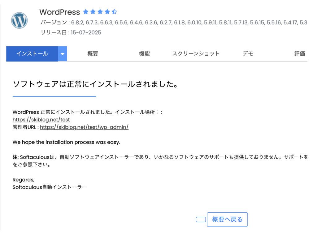 特に重要なのは「管理者URL」です。これを忘れるとブログ記事を書いたり、デザイン変更などができなくなるので、このURLをブックマークなどで必ず忘れない工夫をしましょう。